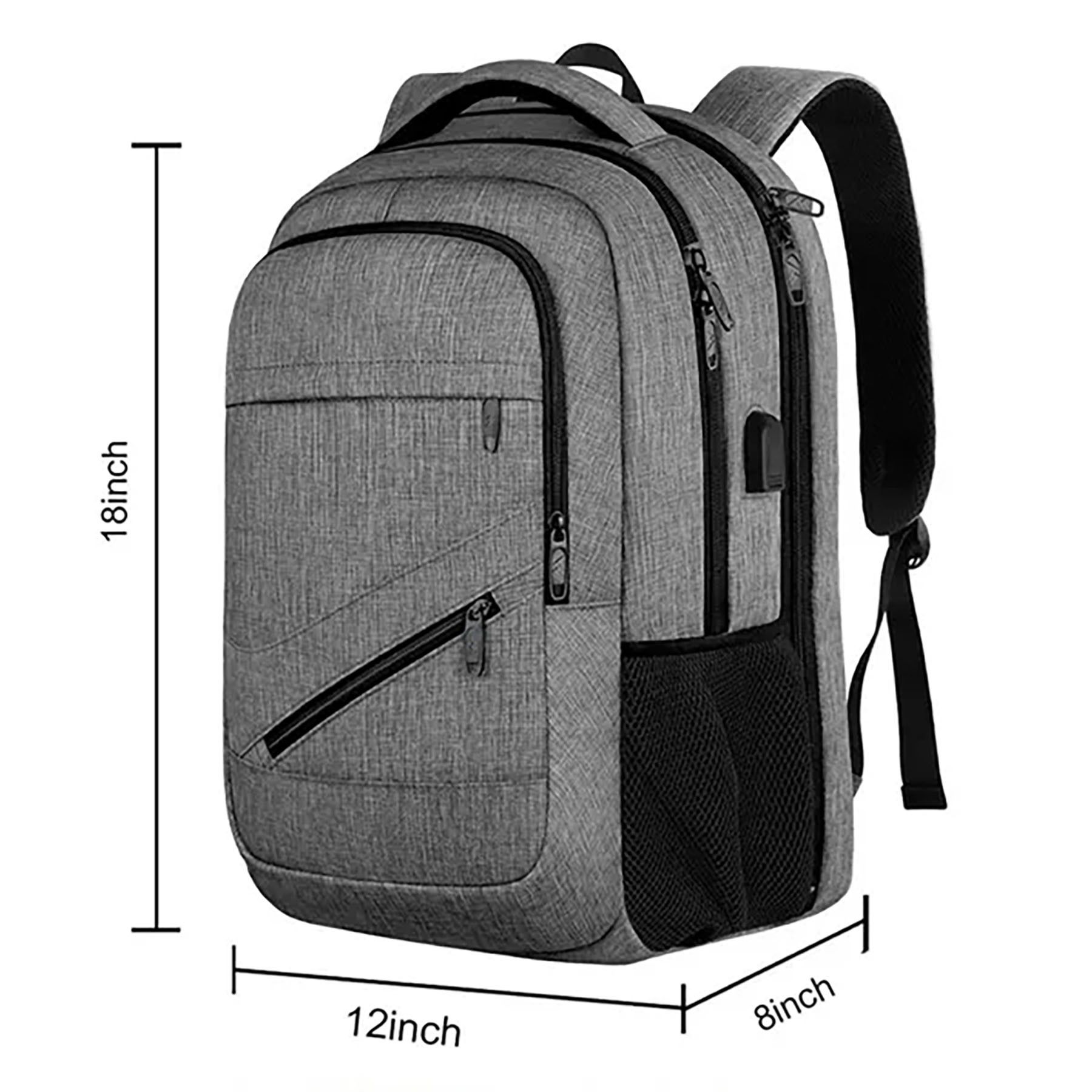 Crafted from water-resistant, eco-friendly polyester with metal zippers, this 15.6-inch laptop travel backpack is ideal for business trips, office work, and outdoor activities. Features an external USB port and built-in cable for convenient device charging on the go. Customization available. 18.11″ L x 12.99″ W x 7.87″ H